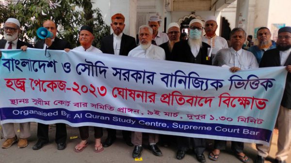 বৃহস্পতিবার (৯ মার্চ) সুপ্রিম কোর্ট আইনজীবী সমিতি ভবনের প্রবেশমুখে আল-কোরআন স্টাডি সেন্টারের ব্যানারে বিক্ষোভ করা হয়। বিক্ষোভ সমাবেশে বক্তারা বলেন, বাংলাদেশ ও সৌদি সরকারের বাণিজ্যিকভিত্তিক এই হজ প্যাকেজ প্রত্যাহার করতে আরও পড়ুন